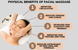 Facial massage moves the lymphatic fluid and toxins out of skin cells. It reduces swelling and puffiness of the skin. It also detoxifies the skin and promotes the skin to repair itself leading to collagen production and elasticity. It gives a brighter, glowing complexion.